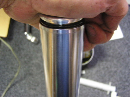 フォークをいっぱいまで圧縮してから オイルレベルを純正規定の110mmに合わせます。 スケールをフォーク内に入れていき、 オイルに触れたところで計測します。 チューブの一番上で計測。 |