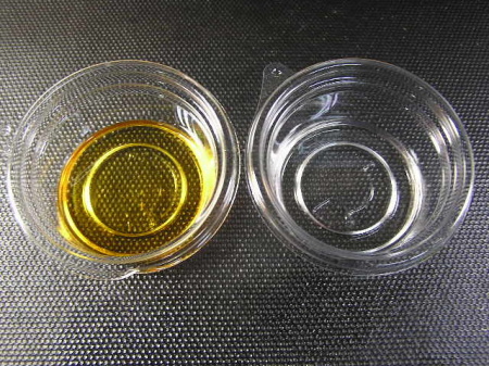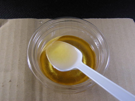 A液、B液を1:1の比率で混合します。(黄色の液体がB液) 混合してから80秒で硬化が始まりますので素早く混合します。 |