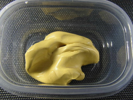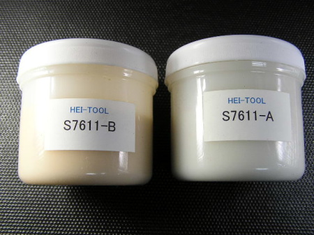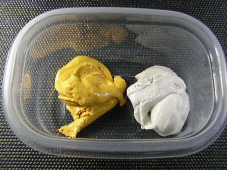 ハイツール白色パテ状(A成分)とハイツール黄色パテ状(B成分) 必要量を1:1で取り出します。多少の分量が違っても硬化します。 |