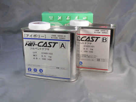 商品名:ハイキャスト ハイキャストはホビーや工芸の分野を対象に開発された注型用ウレタン樹脂です。 特徴 (1) 混合比が1:1であり、A液、B液、共粘度が低いため混合むらが起こりにくく 作業性に優れています。 (2) 混合液の粘度が極めて低いため型の細部にまで樹脂が行き渡り、 精密な複製品が成形できます。 (3) 硬化時間が短く、ウレタン樹脂特有の強靭性を持ち、耐衝撃性、屈曲性に優れています。 |