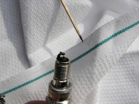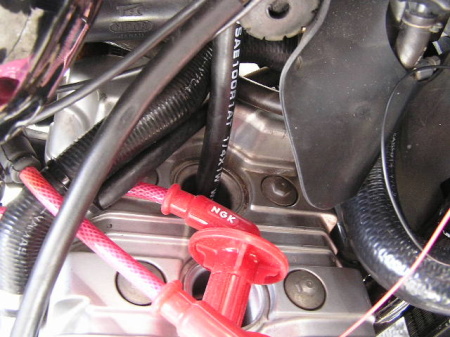 ここでドライスタートの保護をかねて コーティング剤NC202を(数滴)注入しました。 全気筒のプラグを付けて15分放置したらセルを回します。 ※ここではプラグだけでプラグコードは付けません。 |