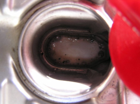 エンジンコンディショナーを注入 コンプレッション中にエンジンが冷えたので 暖機します。 暖機したら全気筒のプラクを取り外します。 泡状のコンディショナーを3~4回に分けて プラグホールから燃焼室にあふれるほど注入します。 車体を左右前後に揺さぶって30分間放置します。 |