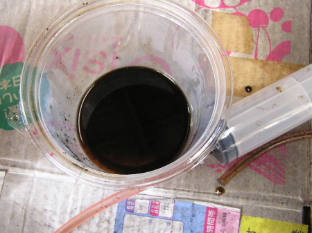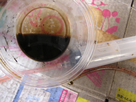 30分放置したら注入したコンディショナーを シリンジ注射器で吸い取ります。 1回目の汚れです。 |