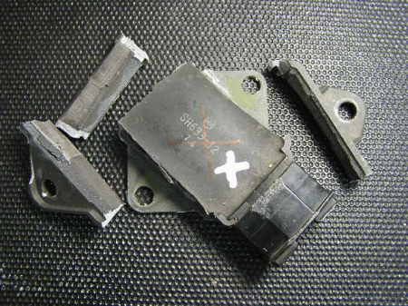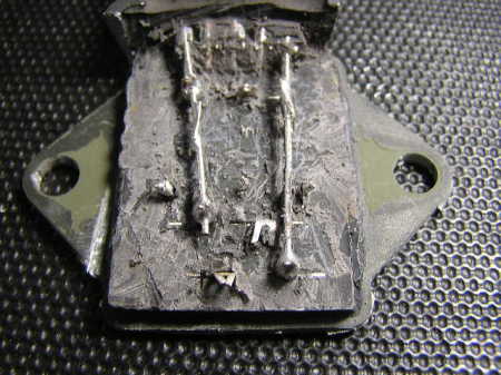 硬い鋳物をタガネで割っていくと数字の入った電子部品がでてきました。 分解ではなく解体になってしまったので、 どこが故障しているか分かりませんでした。 |