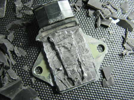 レギュレーター分解 「熱くなる原因を追究する!」 熱くなるレギュレーターの中身が気になったので分解してみることに。 外枠の鋳物をタガネで割ります。 |