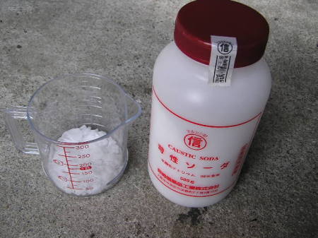 以前にメタルクリーン(金属の油汚れの洗剤)にてエキパイの洗浄をしました。 1日以上、放置しましたがカーボンは思ったほど溶けていませんでした。 そこでカーボンを短時間で溶解するために、 ブレークアップ(界面活性剤入り、弱アルカリ性)と苛性ソーダー(強アルカリ性99%)を 配合して、超強力洗剤(ブレークソーダー)を作ります。 |