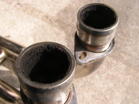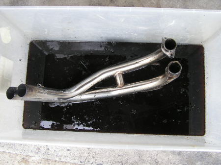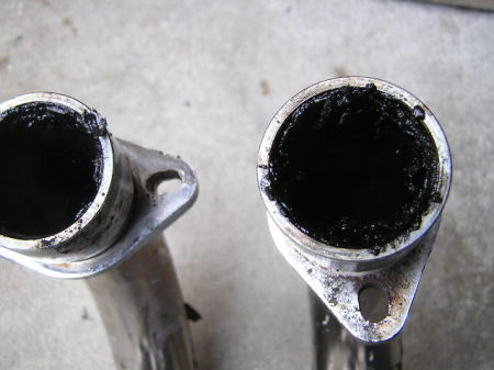 燃料やオイルが加熱されることにより、スラッジからカーボンへと変化します。 油分を含んだスラッジは落としやすいですが、 硬質カーボンになるとアルカリ性の洗剤でないと溶けないようです。 エキパイにはカーボンと思われるものが付着しております。 |