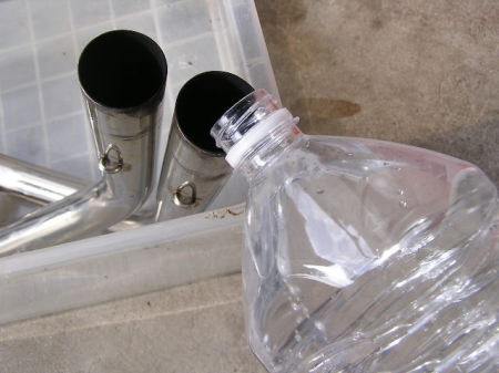 作り方は、 ブレークアップの原液を2Lのペットボトルに約100ccほど入れて、 そこに水を満タン入れて希釈します。 それに苛性ソーダー(小さじ1杯程度)を加え、 ふたを閉めて軽くシェイクしたらブレークソーダーの完成です。 完成したブレークソーダーをエキパイに注ぎます。 |