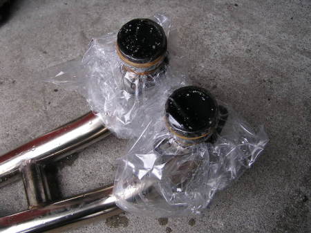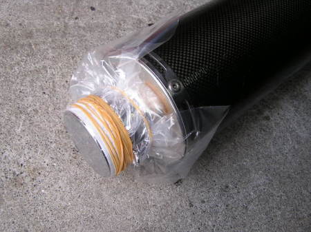 注入したらビニールでエキパイの口を輪ゴムで縛ります。 その後1時間ほど放置します。 放置中に4~5回シェイクします。 |