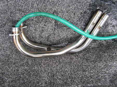 ホースの水圧でエキパイを洗い流します。 |