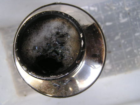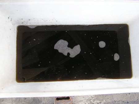 放置後、衣装ケースに入れて確認しました。 真っ黒な汚水が出てきました。 まだ、溶けていないカーボンの破片が残って(浮いて)いますが、 以前使用したメタルクリーンより強力です。 |