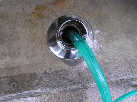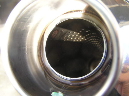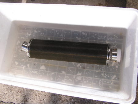 また、ホースの水圧で洗います。 最後にサイレンサー全体をたたいて汚水が出なくったら終了です。 |