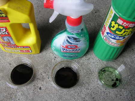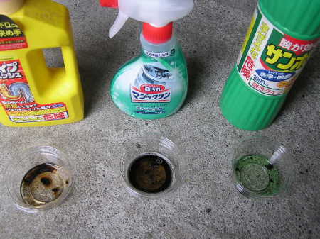 ★市販の洗剤でカーボンを溶かす比較をしてみました。 パイプユニッシュ(アルカリ性) マジックリンスプレー(アルカリ性) サンポール(酸性) まずは、30分後。 マジックリンの液体は「さらさら」です。全体に溶けている感じです。 パイプユニッシュの液体は「とろとろ」です。カーボンの周りだけ溶けています。 酸性のサンポールの液体は「さらとろ」です。溶けていません。 |