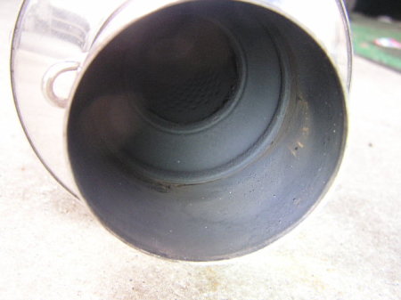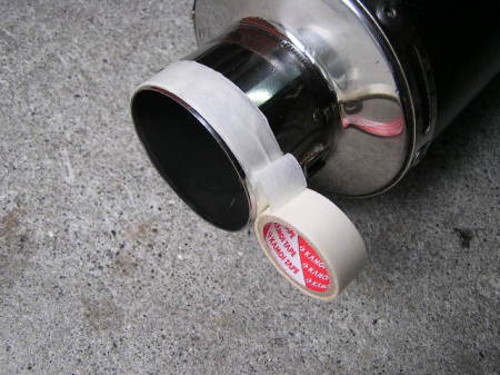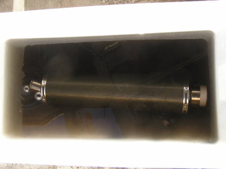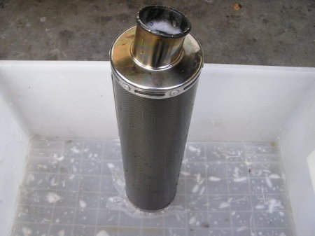 ホースの水圧で洗い流します。 黒い汚水が出てきます。 汚水が出なくなったら、 プラスチックハンマーでサイレンサーを満遍なくたたきます。 するとチョロチョロと黒い汚水が出てきます。 その汚水を再度ホースの水圧で、すすぎます。 汚水が出なくなるまで繰り返します。 |