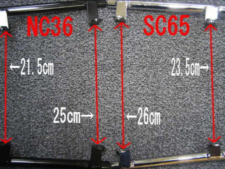 見た目は同じですが幅が異なります。 (NC36) 21.5 25cm (SC65) 23.5 26cm SC65のほうが車体フレームの幅が広いようです。 SC65用のタンデムバーをNC36に取り付けるには工夫が必要です。 バーの幅を力で縮めて無理やり取り付ける。 長いボルトに変えてスペーサーカラーを使用する。 短くカットして両サイドに取り付ける。 |