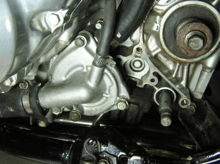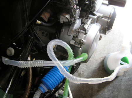 ウォーターポンプ下のドレンを外します。 チョロチョロと冷却水が出ます。 サイドスタンドは容器の中です。 |